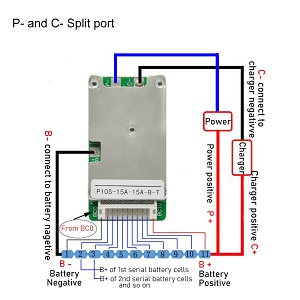-P:این پایه برای خروجی BMS به بار (مثلاً موتور، مدار، لامپ) می باشد. و برای اتصال سر مثبت بار از +B باتری به خروجی مثبت بار سیم کشی می شود.