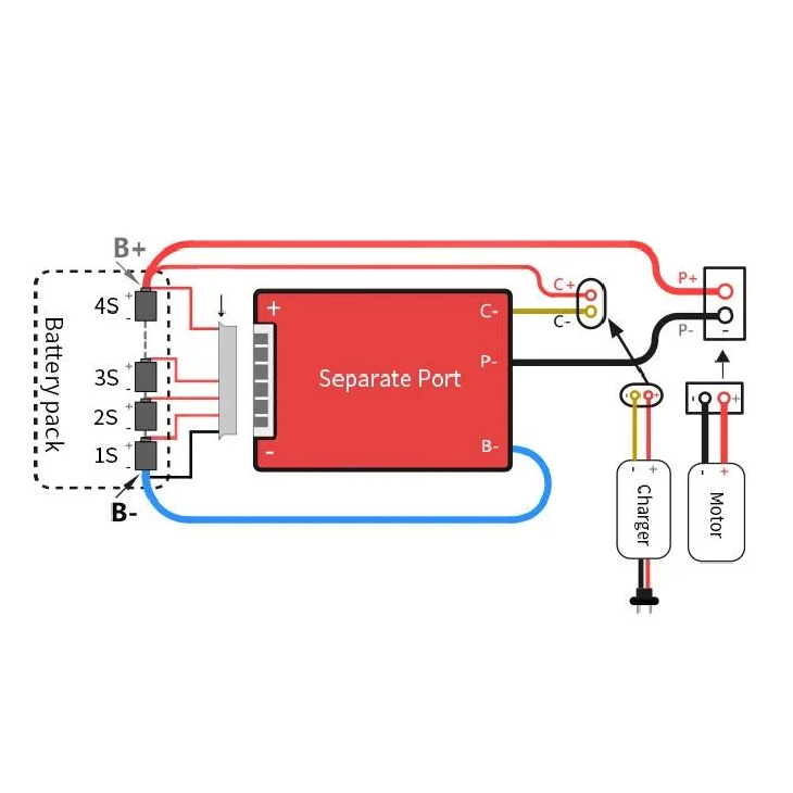 -P:این پایه برای خروجی منفی BMS به بار (مثلاً موتور، مدار، لامپ) و برای اتصال سر مثبت بار از +B باتری به خروجی مثبت بار سیم کشی می شود.