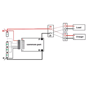 -C-/P :این پایه برای خروجی BMS به بار (مثلاً موتور، مدار، لامپ) و همچنین ورودی برای شارژر می باشد. (از این پایه برای شارژ باتری ها هم استفاده می شود). و برای اتصال سر مثبت بار و شارژراز +B باتری به خروجی مثبت بار سیم کشی می شود.