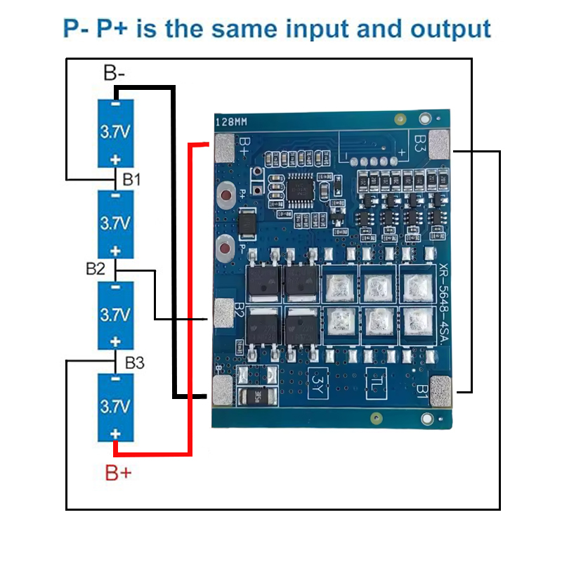 -P:این پایه برای خروجی BMS به بار (مثلاً موتور، مدار، لامپ) و همچنین ورودی برای شارژر می باشد. (از این پایه برای شارژ باتری ها هم استفاده می شود). و برای اتصال سر مثبت بار و شارژراز +B باتری به خروجی مثبت بار سیم کشی می شود.