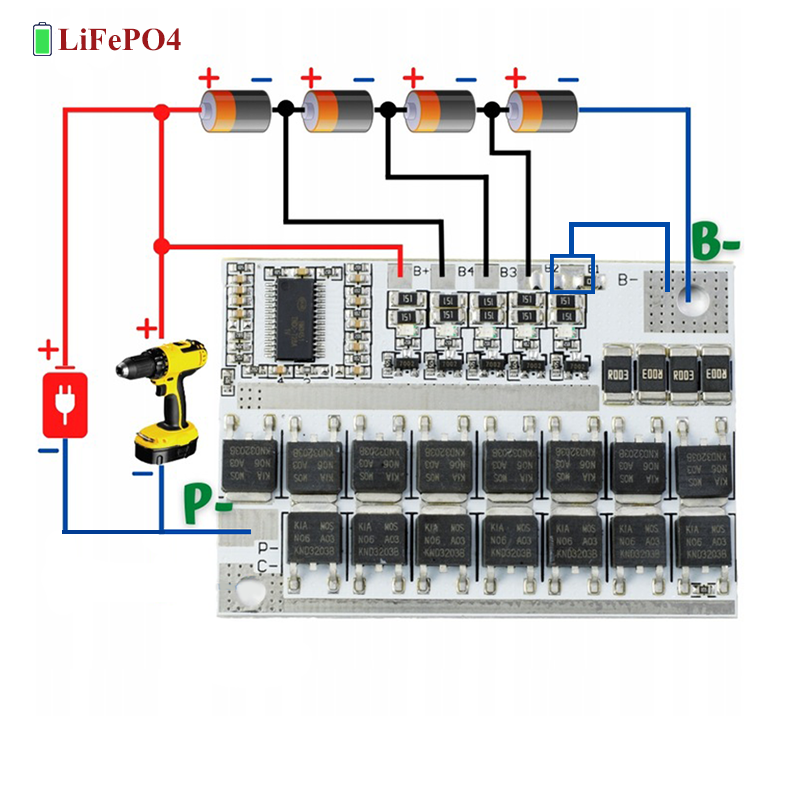 - ابتدا سیمهای تعادلی سلولها (B-, B1, B2, B3, B4) را وصل کنید، سپس P- و C- را متصل نمایید.