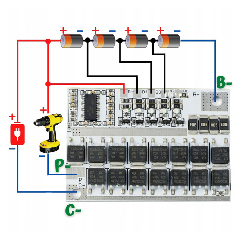 B+ : مثبت مشترک برای شارژر و مصرفکننده (از مثبت آخرین سلول گرفته میشود)